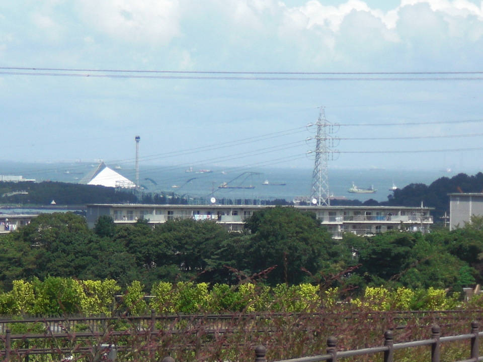 遠くに海が見え,大きな船が行き交う光景を眺められる港の(横須賀港)見える丘霊園,景色も設備もいいけど暑いな〜