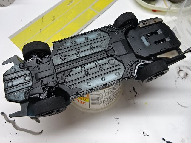そうは言っても、それから半世紀も経つんだから、少しは僕のプラモ塗装も変化はしてる(はず)。シャーシは、薄黒でボカした後で、エナメル黒でウェザリングしてと、まぁ基本的には「やり過ぎ」るんで、エナメルが乾燥したら、綿棒とかで拭き取ったりする。
