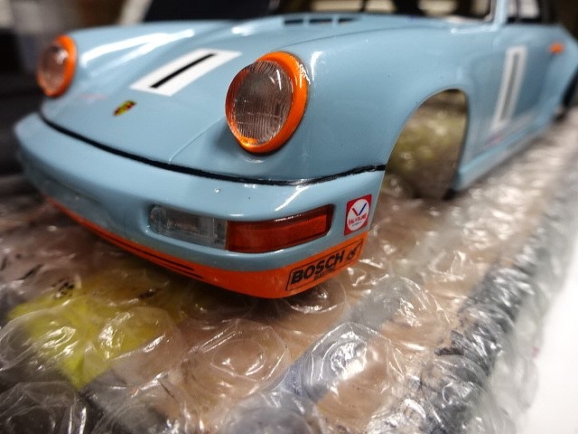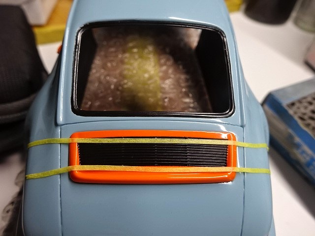 もう一つは、透明度の高いエポキシでして、911独特のライトレンズもデカいテールライトも、接着剤が目立たずに接着出来ました。このエポキシは硬化時間が長いので、位置決めしたら、1oマステで固定していました。