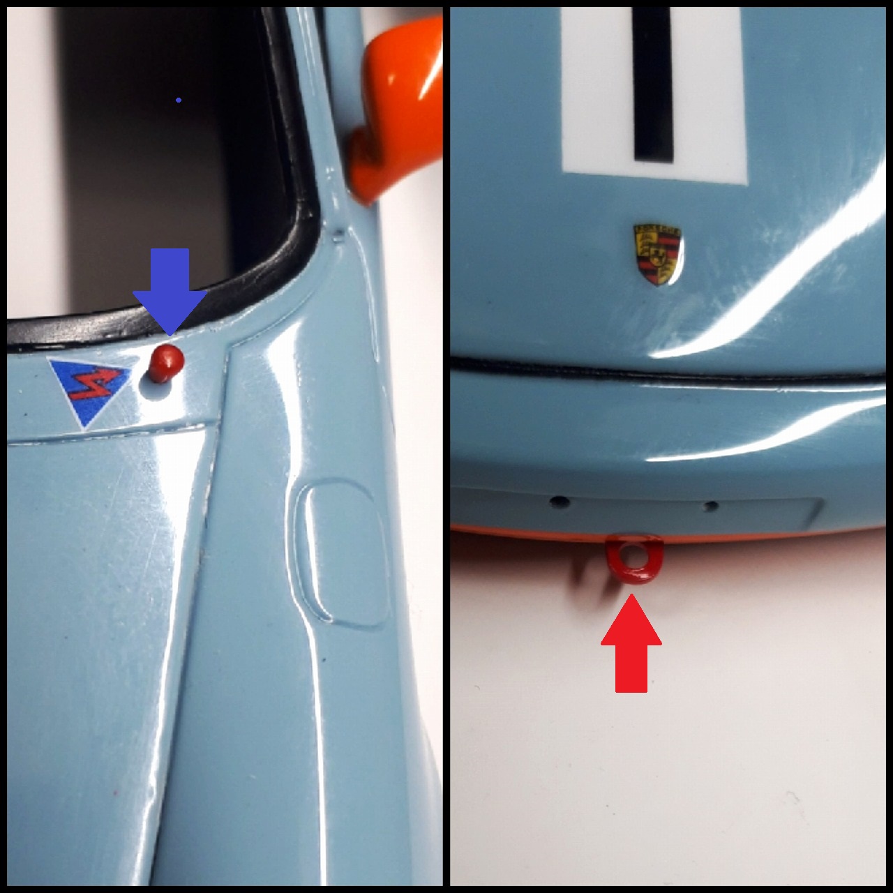 キルスイッチの方は、ボディの塗装の時に位置決めして、デカールを貼りまして。牽引フックの方は、ボディ工作の始めに貼り付けたプラ板に接着しました。
