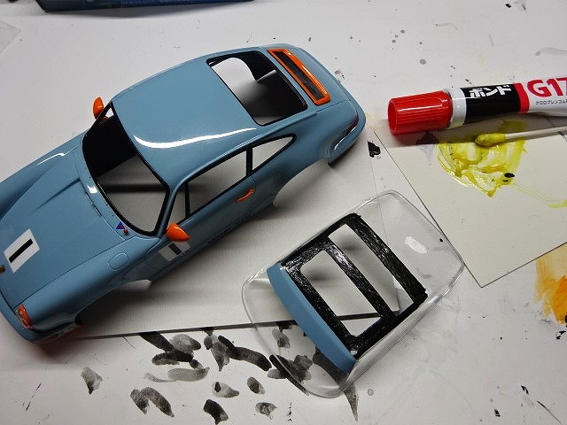 ウィンドウの接着ですが、今回の911みたいな一体物の場合はボンドで着けちゃいます。ボンドをボディとウィンドウに綿棒で塗り伸ばしまして。