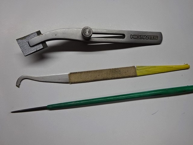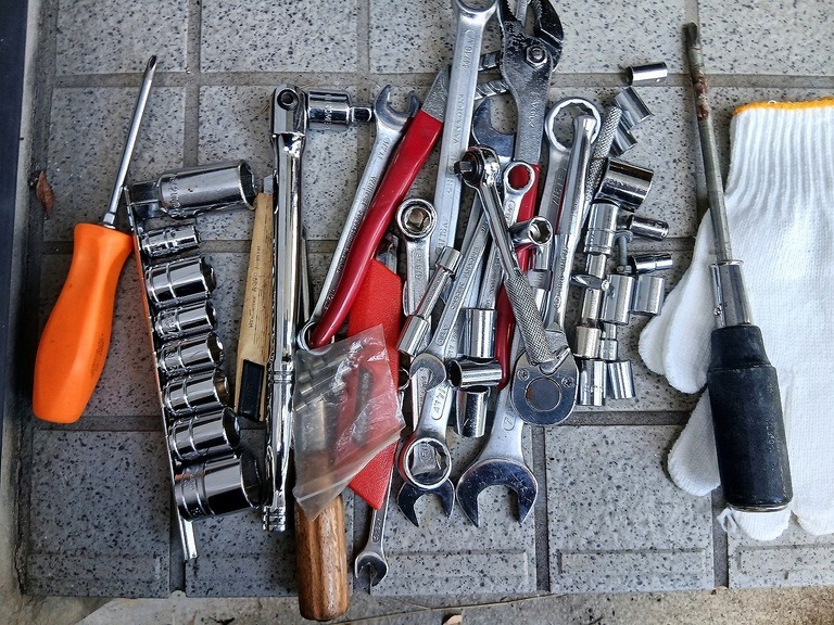 道具箱にあっ、スクレーパーにワイアーブラシで、削り落として行くわけです。いやー、水吸った錆だから汚いし(写真中、どうにか錆を落としました)