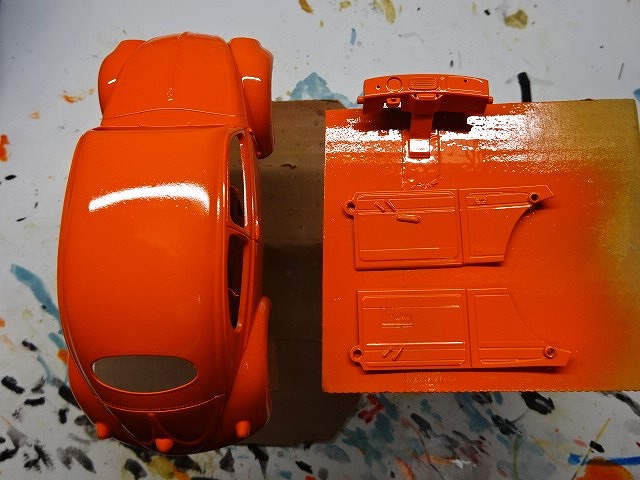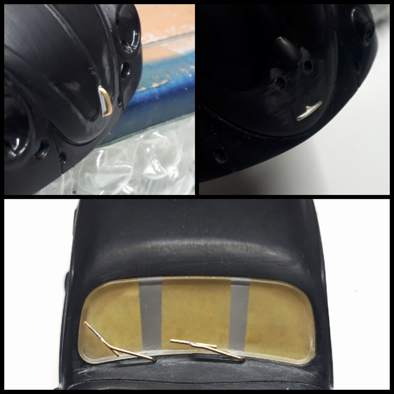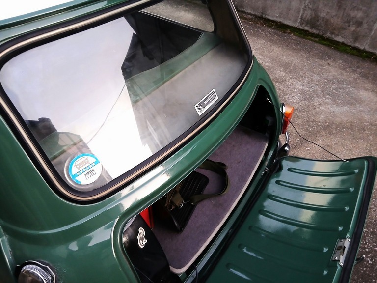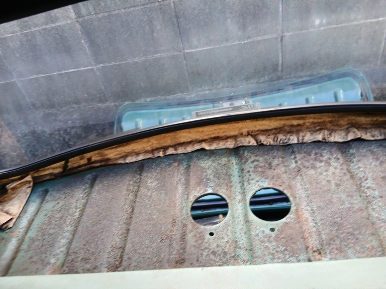 今回は、リアシートの後ろ(名称分からず)のパネルが、ほぼ全面錆びちゃってたのだ。原因としては、リアウィンドウからの親水みたいで、それが内装パネル(段ボールにビニール張り)に沁み込みまして、何年間もかけて錆を発生させてたわけです。(写真上、リアウィンドウ越しにパネルを見た所、真ん中の二つの穴はスピーカーとか設置する為か、年代は違う物かも)