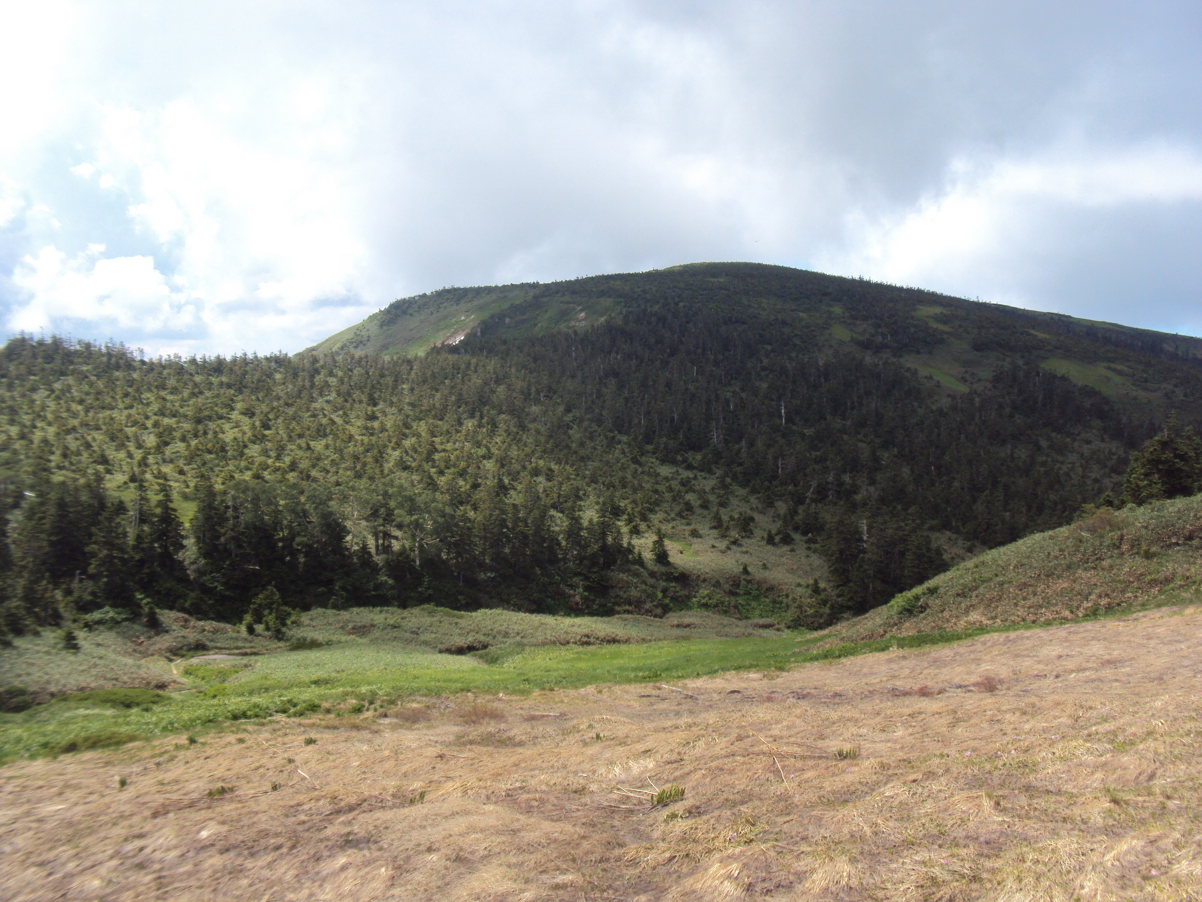 尾根に出ると目の前に平ヶ岳が大きく横たわり、木道を渡り歩いていつの間にか山頂到着。残念ながら遠景はままならなかったが、この爽やかな空気の中で大汗を書いて身も心も汗と共に洗い流されたよう。畳数条もあろうかと思われる木道を広くしたようなところで大の字になって寝転んだ心地よさ! 起き上がって振り返ると、びっしょりと濡れた汗の後が人拓?となって残っていた。