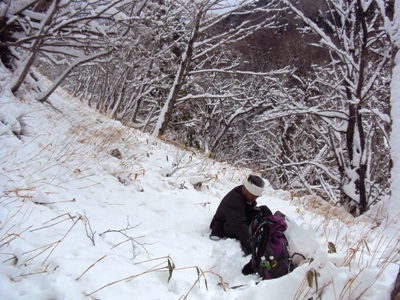 6時に栃木を出て、午後2時5分に栃木に帰ってきました。 当人もビックリの短時間の前黒山1678.3mの登山になりました。 福島県も晴れ、西那須野も一日中晴れの天気予報に後押しされ、快晴を信じて勇んで出かけた登山だったのに、高速に乗ると日光や那須の山々は雲に隠れて影も形もありませんでした。 西那須野で高速を降りるとワイパーが必要になりました。でも直ぐに雨は上がり、綺麗な虹が西の空を飾ってくれました。風は強いけれど、青空が雲のほころびを滲ませていました。 5日前の雪は道路には残っていませんでした。もみじラインの料金所はまだ8時前なので無人でした。前黒山の林道も全く雪は残ってなくて、でこぼこ道ですが無人小屋まで車で進めました。 流石にここ迄来ると雪が積もってて、帰りに車を出し易い様に雪の上の道端に停めました。前回はもみじラインの料金所を8:18に出発したのに、今回は林道の無人小屋を8:05に出発。連休初日で高速が混み20分以上ロスしましたが、それでも無人小屋からの出発時間が50分近く短縮になりました。 でもこの時空から白いものが落ちてきました。もう直ぐ5月だというのに、天気予報は関東は山沿いも含めて晴だったのに雪が舞っているのです。登山道も昨日の雪が5cm以上積もってました。 今日だけは晴天を信じて出かけてきたのに、完全に予報が裏切られました。 でも塩原温泉街は晴れていたので、山の上だけかもしれません。 22日に11時半まで登って断念した地点に今日は何と9:18に着きました。登山道の雪も30cmと5cmでは歩き易さが違います。 林道を外れ、藪漕ぎで直登する地点から約50分、雪と笹薮の中を相棒がピンクのリボンマークを遺しながら、10:19に雪の降る山頂に立ちました。残念ながら視界は全く望めません。 でも満足でした。経験者向きといわれた前黒山に2時間15分で登り着いたのですから。しかも雪の上を雪が舞い散る中をです。22日の経験が充分に生かされたと思いますが、3月からの8度の雪山体験もプラスになったと思います。登頂が予定より早すぎた為、山頂での食事は諦めて、即下山開始。これもビックリでした。11時35分に雪の中に停めた筈の車の駐車地点に戻ってきたのです。でも全く雪は消えていました。しかも上からは雪が落ちてくるのです。 今回の登山は予定をかなり下回る3時間半丁度で前黒山制覇。老人パワー侮るなかれ! 上から落ちてくる重いボタン雪と、藪漕ぎで腿膝がびしょぬれになったズボンを脱ぎ捨てるのに一苦労。何せ手は寒さで悴んで思うに任せず、スパッツで覆った筈の登山靴も、2枚重ねの靴下はグチョグチョ。雪降る中での着替えになりましたが、これが不思議で、着替え終わると見る間に青空が広がってきて、降る雪も消してくれました。視界が急に広がりましたが、高い山の中腹より上は雪雲に覆われていました。天気には裏切られましたが、凄い体験になりました。決して雪を侮っているわけでは有りませんが、雪に対する恐怖感はかなり失せたと思います。 道の駅の近くのかくれやのお蕎麦屋さんの温かいうどんで体を温め、西那須野から高速で37分、栃木ICに2時に着きました。これで栃木百名山の92座めを踏破。万歩計は14,701歩でした。 今ブログを書き終え、これから17:00から始まる吹上地区公民館でのオフタイムファミリーコンサートに行って来ます。 |