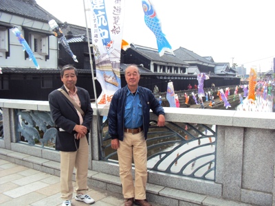 幸来橋の上で、鯉のぼりの泳ぐ巴波川と120mの塚田の黒塀をバックに記念撮影A ここから巴波川沿いに横山郷土館、市役所第二別館、蔵の街美術館、観光会館に飾って有る歌麿の複製画「深川の月」など蔵の街を駆け足で流す。