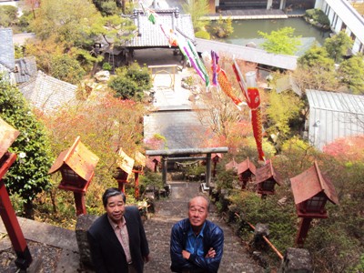 お昼は太子館がよかろうと、皆川城址跡を横目に柏倉に向かうが、生憎定休日。中には入れたので急勾配の太子神社に登る。3人の年齢を足すと1の位を四捨五入すれば200歳。かなりハードな登りだった。神社の上から二人を入れて太子館境内を写すBが、急斜面の実感が写す切れなかった。 お昼は太子館を諦めて、出流の出流山荘まで足を延ばした。注文を聞きに来たお姉さんが、前回リュックを提げて伺ったことや、その後のお山の一匹狼さんや横浜のnoripiさんが伺ったことを覚えていて、話題にしてくれたので、ちょっぴり鼻高々。顔の広さというかお腹の大きさ(メタボッコリ)を二人に自慢?