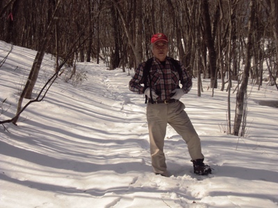 途中迄は残雪も無く、足元が安定したなだらかな登り道で、無風で日差しは柔らかく、気温はやや低く、あまり汗もかかず、最高のコンデションでした。相棒はスパイク付の長靴を履き、小生は途中からアイゼンを履きアイスバーンの雪に備えました。昼から日が翳り、下山途中に小雪も舞いましたが、大変快適な登山でした。