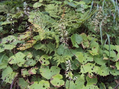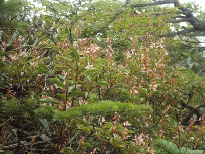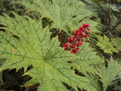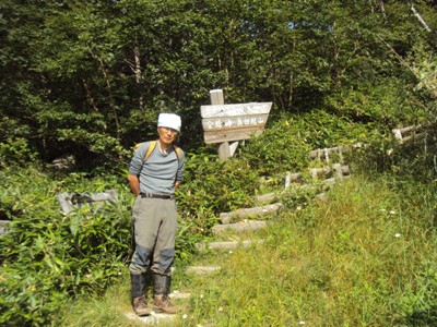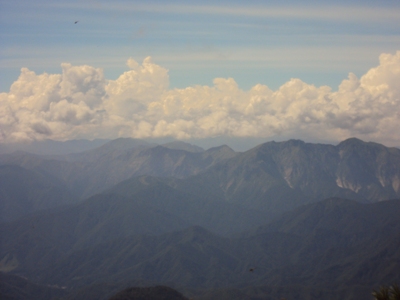 登山道はかなり濡れていました。実は昨日の夕方夕立があったそうです。今日も天気は上々ですが、午後は雷雨が心配でした。でも途中黒雲も出てきましたが、結果的には心配無用でした。 途中で擦れ違った高知県から軽のミニバンで百名山をトライしている70歳位のお爺さんから、「山頂では富士山も良く見えたよ。途中5ヵ所位鎖のある岩場があるから」と忠告を受けました。 注)筆者はお爺さんと5歳と違わないのに勝手に若い積りになっています。