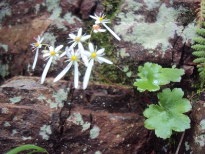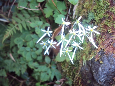 岩の鎖場で見つけたダイモンジソウBです。花弁が大文字の大の字に似ているので付けられたとか。 岩場の緊張の一瞬を和ませてくれる小さな可憐な花でした。