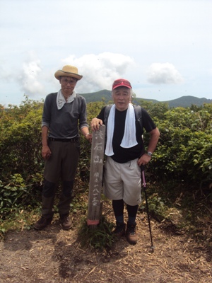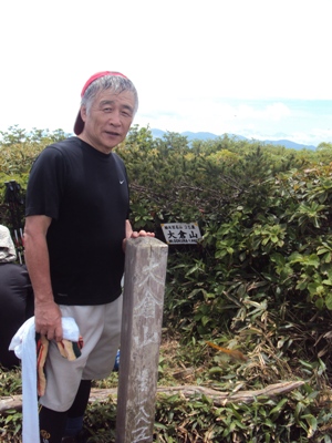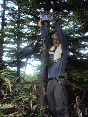 湿原の奥で、木道に腰掛けて珈琲軽食休憩ののち、鬼怒沼山2140.8m、栃木百名山第13座に向かいました。30分位で分岐に到着し100mの標高差を一気に駆け上りました。 AM10:46。山頂は見晴らしは悪く(たとえ良くてもガスで見えず)、三角点は有りましたが、山頂標識は有りませんでした。 唯一、栃木の山紀行の標識の真ん中部分が、コメツガの木に残っていて、相棒のスーさんが近辺を捜して、その破片を見つけ、両手で持って山頂写真に納まりましたC。