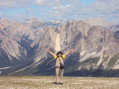 ドロミテ山塊をバックに大欠伸??? 否、万歳をしているメタボッコリ!!!???