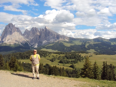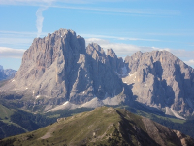 三日目の夕方オルテッセイの南にあるアルペ・デ・シウジにロープウェイで登りました。山頂駅は標高2005mで大きな高原になっていました。 左後ろの山がサッソルンゴとサッソピアットです。 宿から見たサッソルンゴが、別の角度、3方から眺めると、こんなにも形が変った山になるのです。 ドロミテは期待に違わぬ素晴らしい山塊でした。コルティナ迄は70km以上もあり、その先はチロル、オーストリアに続いています。世界遺産に相応しい大自然の宝庫でした。