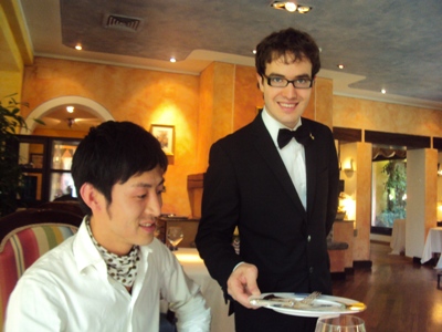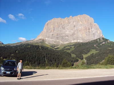 三日目はガルデーナ峠をこえてコルティナ・ダンペッツォに向かいました。その時の峠から西に聳えるサッソルンゴの山容です。コルティナは水の都ベニスと同じ、ヴェネト州べッルーノ県にあります。 標高2000mを越える峠の冷やかな朝、貫けるような空の青と、サッソルンゴの岩山が大歓迎で御出迎え。お天気に感謝!! 左下に今回の旅で2,400qもの長距離を運転してくれた愚息とレンタカーのNISSAN MICRAです。日本名マーチ。