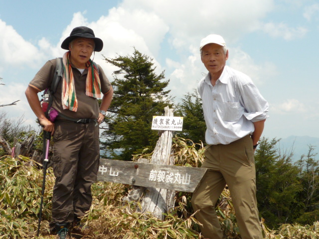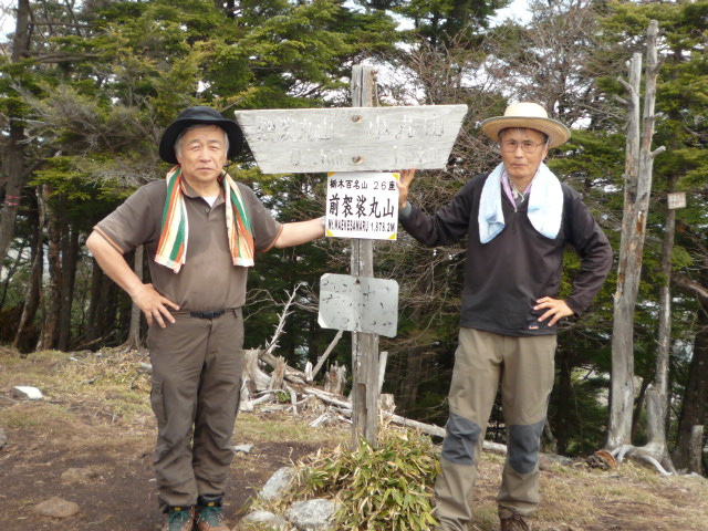折場登山口には26,7台車が駐車していました。 登山口から賽ノ河原経由で小丸山を経て前袈裟丸山山頂A迄2時間55分かかり11時10分着。 山頂には20人位の登山者が居ました。 いつものカップみそ汁とおにぎりの昼食を取り、11時30分に 「前袈裟丸山から後袈裟丸山の間・八反張は風化が激しく、危険ですので通行を禁止します。東村」と書いてある立て看板を無視して後袈裟丸山に向かいました。 確かに危険個所が2箇所あり、あとは藪漕ぎで難儀しましたが12時7分に後袈裟丸山山頂1908mBに辿り着きました。 その奥の奥袈裟丸山が最高地点になりますが、道も不明確だしそもそも入山禁止なので、中高年3人組のこれ以上のチャレンジは危険この上ないので、この地点までで諦めました。
