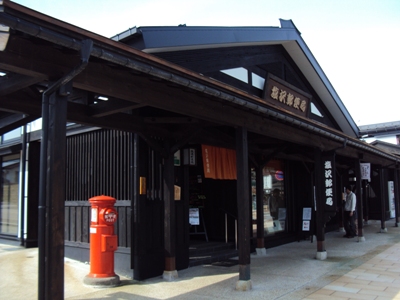 塩沢郵便局Bです。 赤い郵便ポストが目を引きます。 軒先は雁木作りで繋がれており、雪の多い冬場はお隣りとお隣りがトンネルのように繋がります。 電柱は地中に埋設され通りは広々としています。