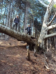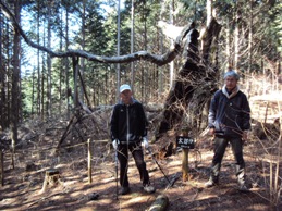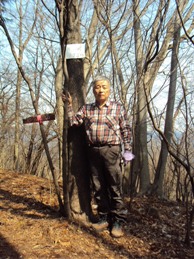 ガイドブックでは往復2時間20分と書いてあったが、ブログには林道を利用すれば最短25分で登頂可とか。 楽しようとする気持が仇となって不安を募らせる。先ず明神トンネルを越え如来沢林道入口バス停を見失うことがケチの始まりで、通り過ぎて戻った林道はとんでもない悪路。途中で舗装は無くなり、轍跡でハンドルはとられるは、溝のような泥んこ道で新車の底は擦るは、2度も道を間違えて行き止まりに出てしまうはの連続でした。 それでも如何にか登山口駐車場に到着し、カップみそ汁とお稲荷さんとお赤飯とミニあんパンで昼食@。いちごのデザートは格別でした。 昼食後は20分強で山頂に到着しました。山頂Aの見晴らしは殆どありませんでしたが、木々の合間から八溝山の全容が垣間見られました。 途中でお会いした地元の藤田さんから太郎ブナB次郎ブナCを教えて貰いました。太郎ブナは雷に打たれてか?朽ちていましたが数百年の寿命を全うした姿が樹林を絞めていました。次郎ブナは最近倒木となったのか根本から折れていました。 少年の様な気分で颯爽と木の上に登った二人の老人の姿は如何でしょうか? 格好いい・・・かな??? |