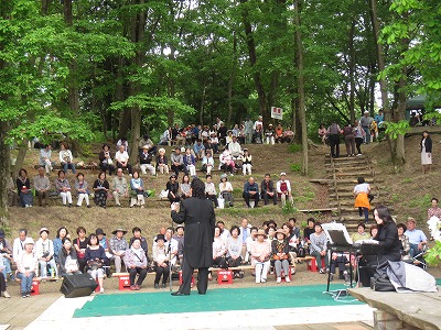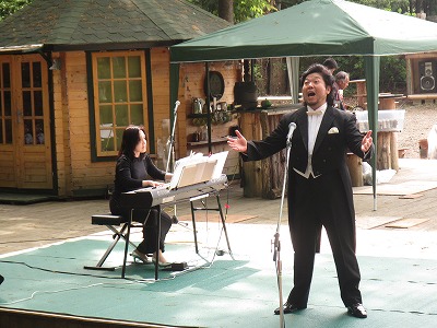 ピアノソロも含め10曲を、イタリア語スペイン語のテノールの素晴らしい 美声を聴き届け、後半は日本の曲を10曲、緑萌える山中の青葉滴る大自然 の舞台で土方協子さんの素晴らしいピアノ演奏で、心の奥まで澄みきらせ て頂き楽しませて貰った。 |