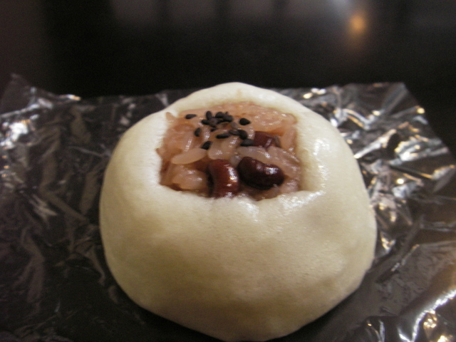 まんじゅうの皮は甘くて中の赤飯は塩辛く