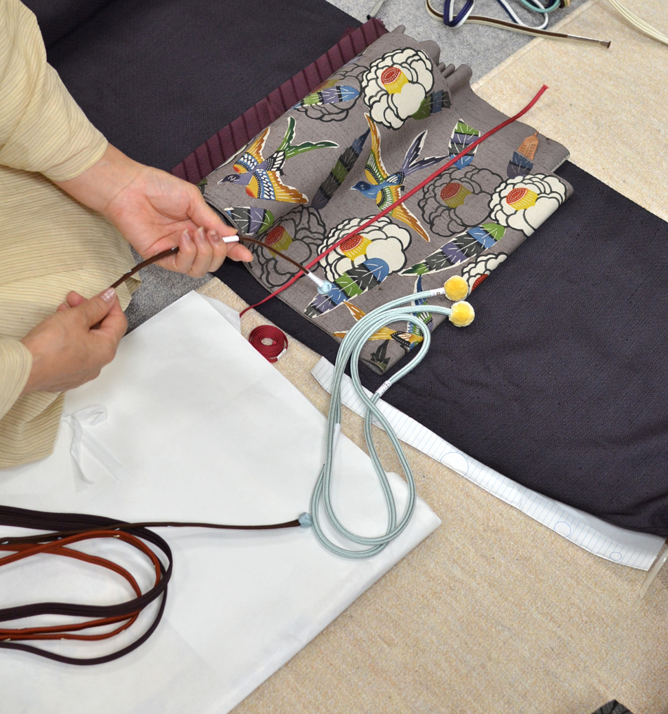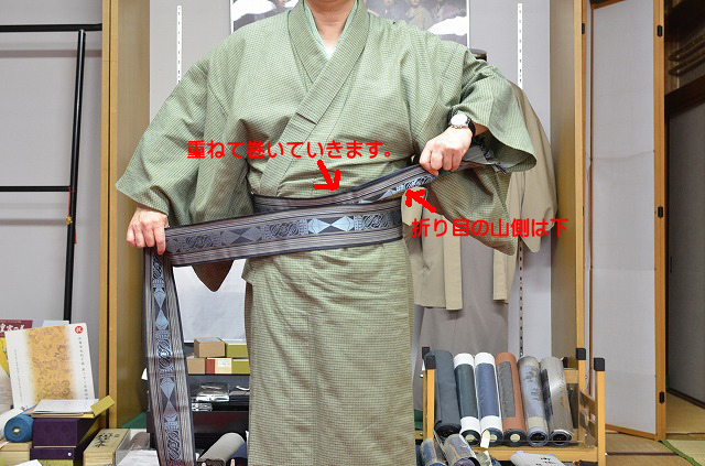 手先を上にしたまま、たれの方を重ねて巻いて締めていきます。