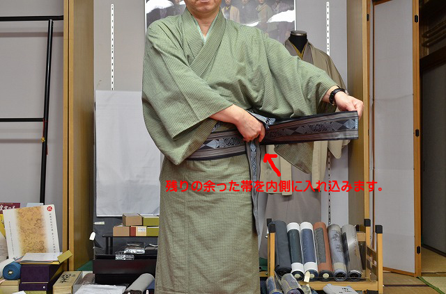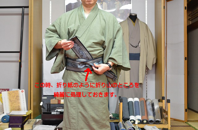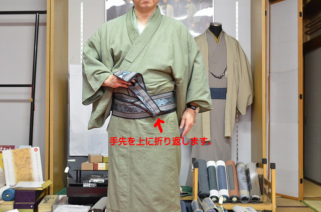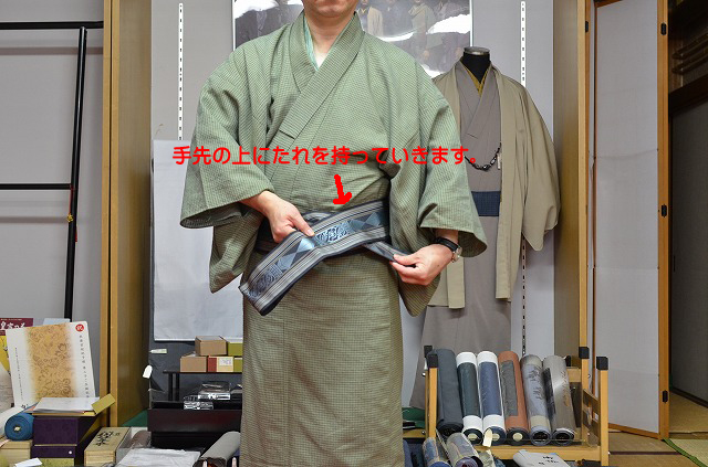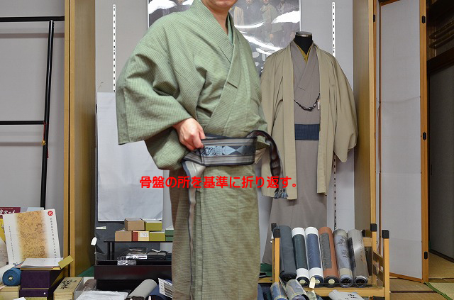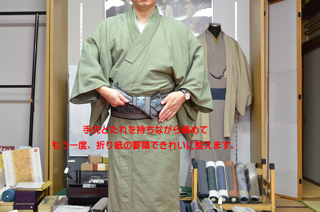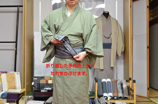 ポイントです↓↓ト余ったたれを、内側に織り込んで行きますが、折り返すポイントは、体型や帯結びの大きさの好みによって、若干変わります。