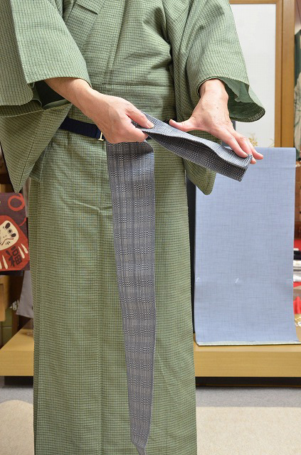 まずは角帯の片方を2つに折り、手の幅約20センチ位を(手先)の長さにします。ここら辺は、お好みや体型、帯の種類によって多少変わります。