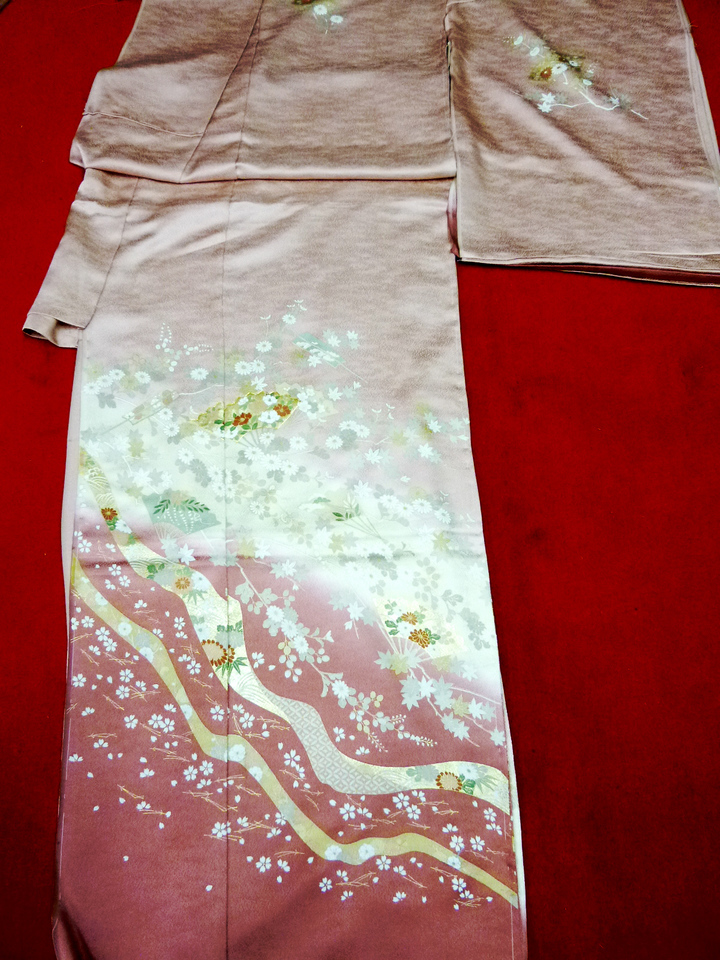 吉澤織物の逸品付け下げ(七宝の地紋の薄ベージュ色につゆしば柄の中に四季の花々)
