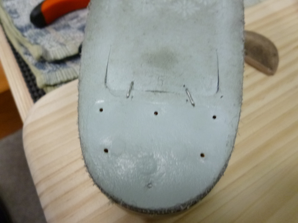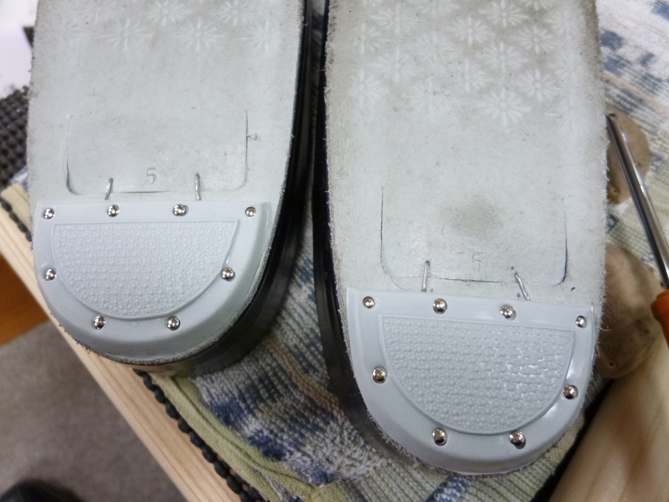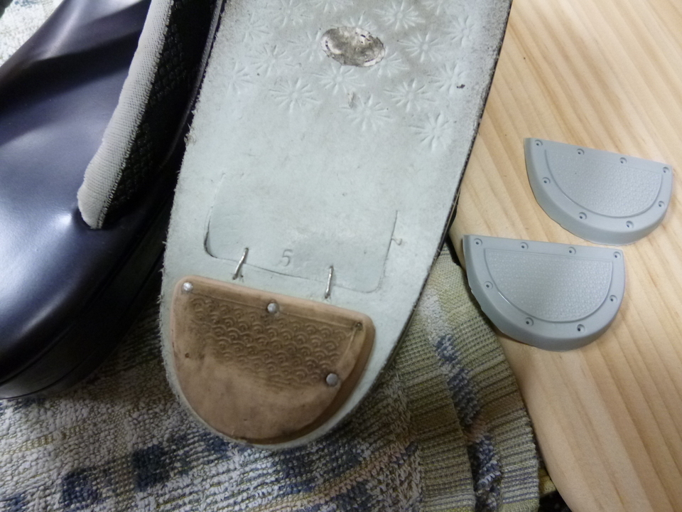 写真は、踵ゴムが磨り減って、留め釘の頭まで磨耗していたのを、新しい踵用ゴムに交換しました。