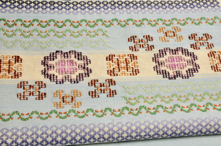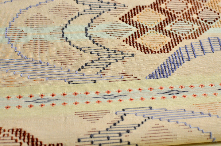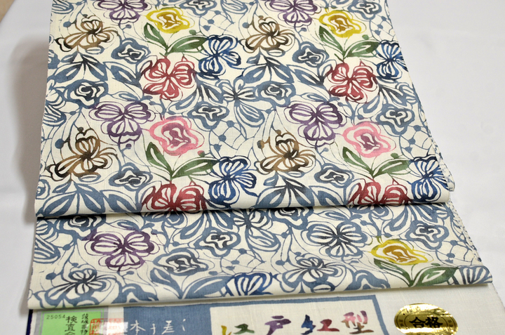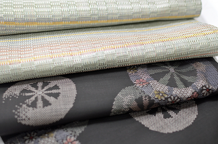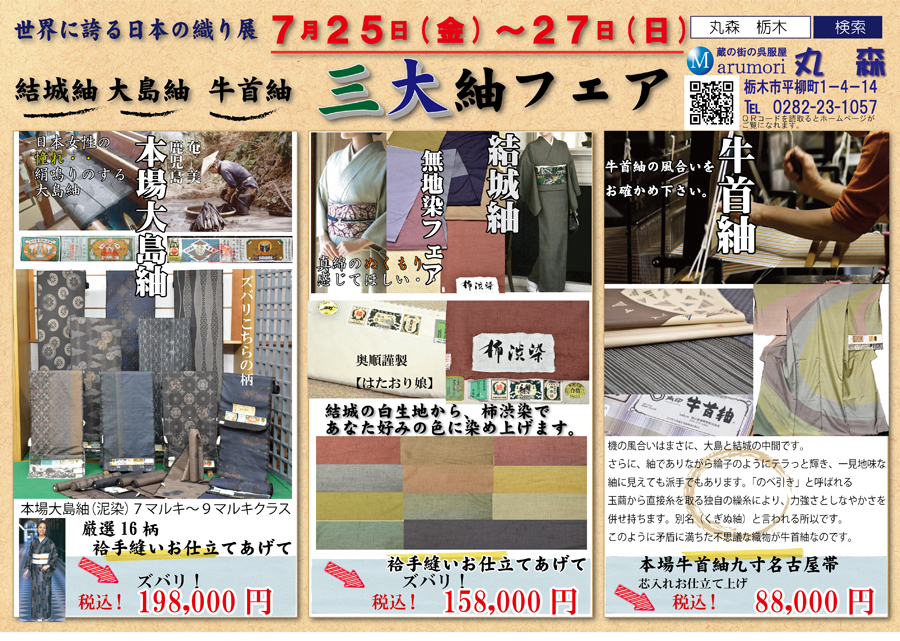 7月のフェアのチラシはこちら 帯は当店の得意の妄想(^^♪コーディネイトで、博多織の全通袋帯をのせてみました。さらに、両面柄です。呉服屋泣かせの万能帯で、紬から小紋、色無地まで合わせやすい帯です。丸森 蔵の街の呉服屋