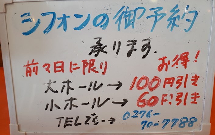 お受け取り日の、3日前迄にご予約いただければ、大ホールが100円引きになります。
