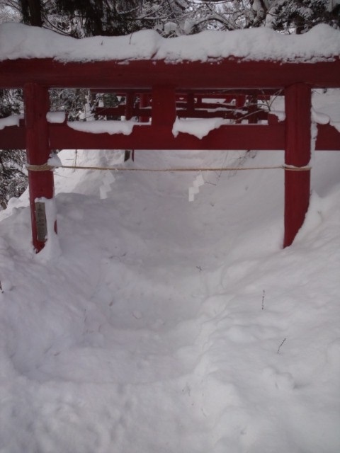 くぐる時に頭がぶつからないように、稲荷神社の鳥居の下が、雪を階段状に掘ってありました。