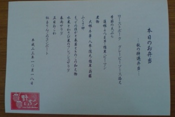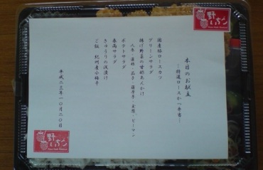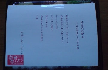 120gと大きめの手作りハンバーグにきのこのソースをかけた、秋の特選ハンバーグ弁当です。