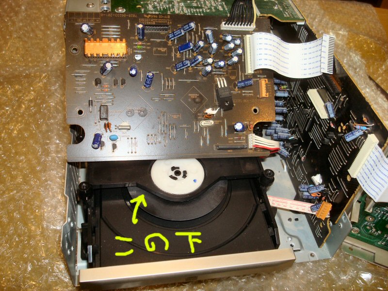 さて、CDレシーバーですがこういったものは小さな筐体にすべてを詰め込むので、取り外し作業がことのほか大変です。CDデッキならカバーを外せばすぐにピックアップにアクセスできますが、狭い中でMDユニットを外し、コントロール基盤を外し、ブラケットを外し、CDユニット外して裏返さないと出てきません。