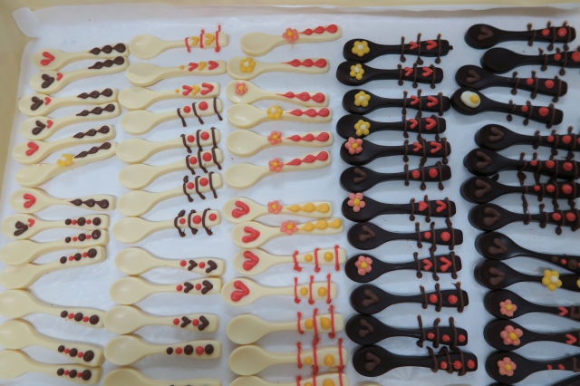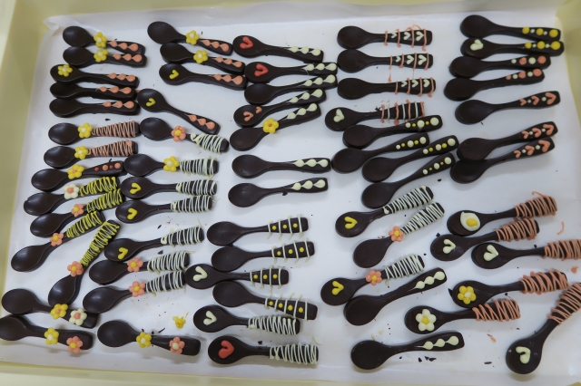 チョコレートのスプーンに手作りの花や模様をあしらった