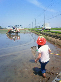 ゆぅは、おたまじゃくしを捕まえるのに必死。