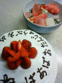 今夜は、美味し〜海鮮丼と、ケーキでお祝い。