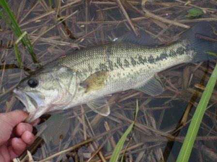 最初のポイントで、子バスがルアーを追ってきますが、ヒットには至りません。