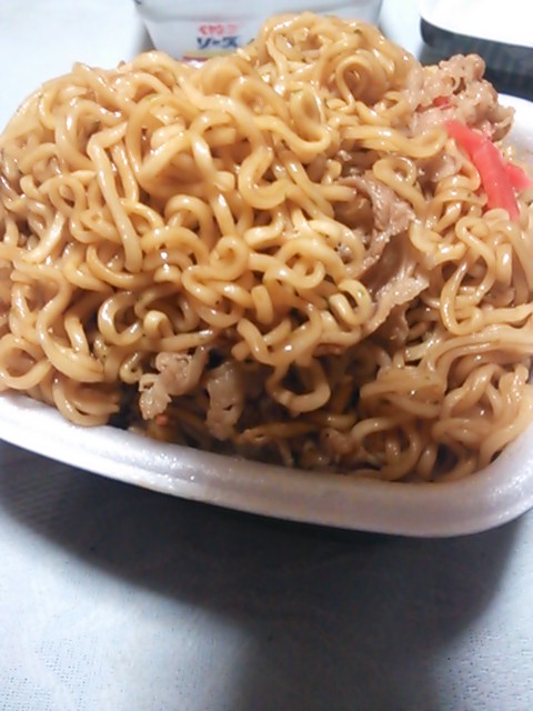 ぺヤングの販売が開始したって事で、やきそば牛丼を作ってみました
