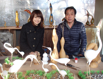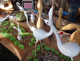 近田さんはひょうたんの自然の形を活かし、形の異なる種類のひょうたんの表面に花の絵を描いたものや鶴に見立てた作品なとがあります。 ひょうたんを吊るして真っ直ぐな形にしたり、曲げて育てたりしたものを使って作品にしているそうですよ(*^_^*)