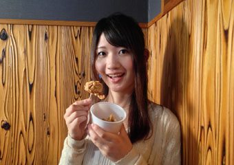 唐揚げは100g(3個分)を小さなカップに入れて販売しているので、気軽に持ち歩けます! 何かつまみたいときにぴったりで、しかもリーズナブルなので学生さんにも嬉しいっ\(^^)/店内で食べることもできますよ★