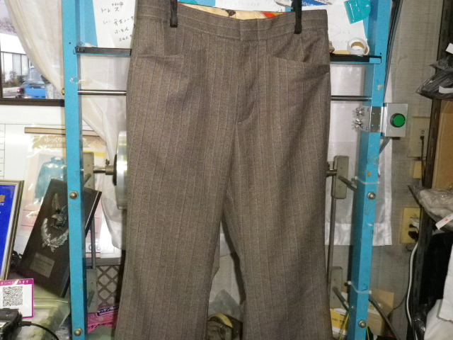 センタープリーツのないパンツはシワを防ぐためピンチハンガーで吊して納品しております。