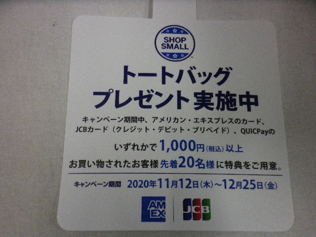 キャンペーン期間中、「アメリカン・エキスプレス」のカード「JCBカード」のいずれかで1000円以上のご利用があったお客様、先着20名にトートバッグをプレゼント致します。