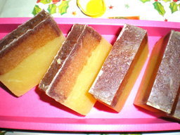 左 レモンバーベナのせっけん(ローズピップパウダーのレイヤー)。中央同じオイルで上の部分に刻んだものを乗せてみました。そして右はオレンジショコラ♪OP(オプション)小豆パウダーやカカオパウダー配合。EO(エッセンシャルオイル)はバニラ、スィートオレンジ、マンダリンなどなど。