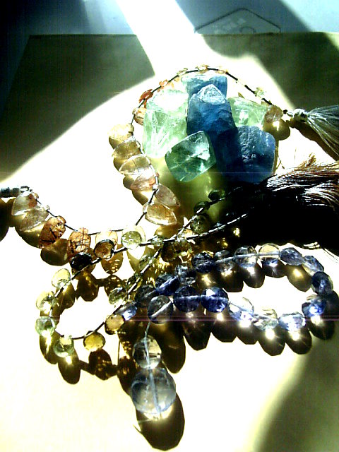 美味しそうなロックキャンディーみたいなフローライト原石風! 見ていて飽きないなぁ〜。 秋用レッドルチルの葉っぱもレアなビルマ産アメジスト(紫色じゃないんだよね・・・・。渋いグリーンでグリーンアメとも違う・・・すごいテリで深みがあって、・・・で今回勉強になったアイオライト。なんか傷のところが磨き粉ではないものが付着していたので洗剤に(ガラス用専門の)つけて振り洗いしたらしっかりブルーになって。でも色の抜けた石はなんとも言えず上品な色になって、な〜んだ色濃く着飾るより素のほうが断然美人さんじゃん〜!って。光を通してきれいだな・・・って。